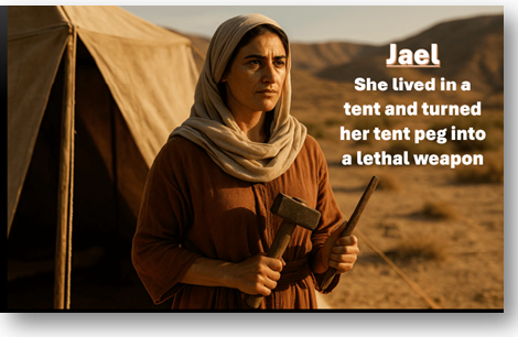 “Jael, the wife of Heber the Kenite, famously killed the Canaanite general Sisera by hammering a tent peg through his temple while he slept in her tent, fulfilling a prophecy by the Israelite judge Deborah that a woman would bring Sisera’s downfall. She offered him hospitality—milk and rest—before using a common domestic item, a tent peg and hammer, to kill him, later showing his body to the pursuing Israelite commander, Barak, leading to Israel’s victory.” (Google AI)
